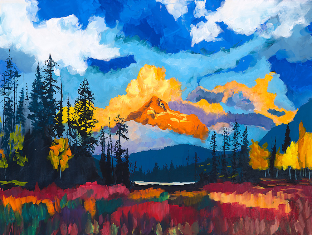 "Cascade" is a captivating representation of nature's vibrant palette, showcasing a breathtaking landscape where majestic mountains rise against a backdrop of dynamic clouds. The artwork features a rich tapestry of colors, from the fiery oranges and yellows of the sunset to the deep blues of the sky, creating a harmonious balance that draws the viewer in. The foreground bursts with wildflowers and lush greenery, inviting a sense of peace and tranquility.
