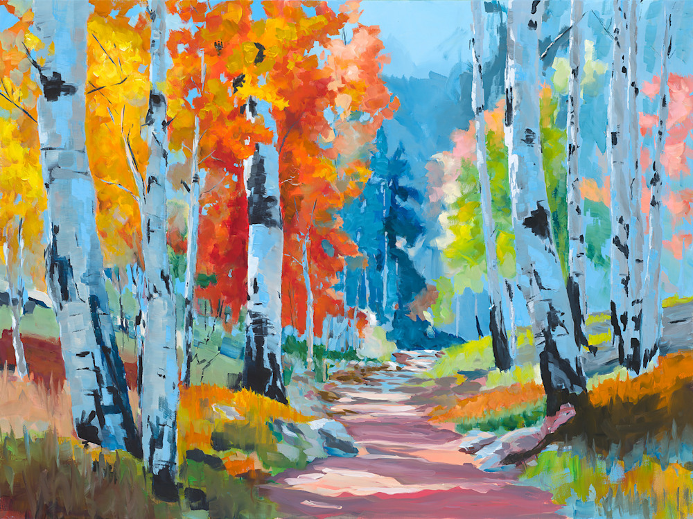"Late Summer Aspens" is a captivating portrayal of a serene forest pathway, showcasing the stunning transformation of aspen trees as they transition into autumn. The artist masterfully blends warm yellows and oranges with the cool blues of the sky, creating a harmonious scene that draws the viewer in. Each brushstroke reflects the artist's deep appreciation for nature, inviting you to experience the tranquility of this vibrant landscape.